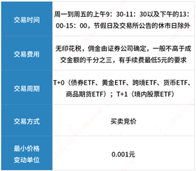 了解了买卖ETF的基本交易规则和流程,接下来我们看看除普通A股股票型ETF外,其他几类主要ETF的交易特点: