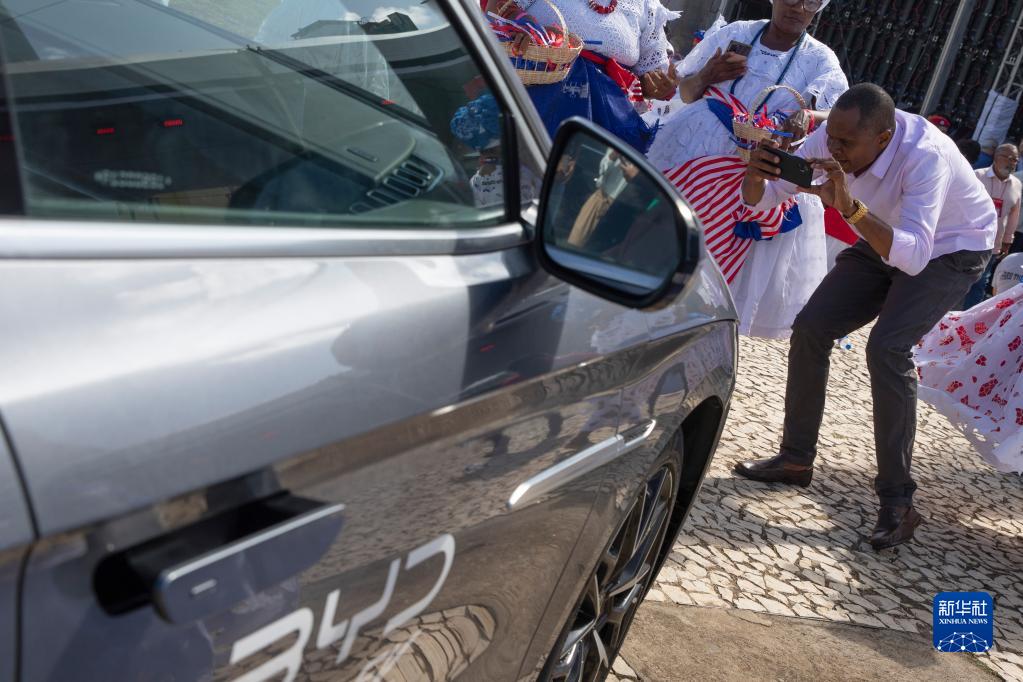 7月4日,一名参观者(右)在巴西巴伊亚州首府萨尔瓦多拍摄一款比亚迪纯电动汽车。新华社记者 王天聪 摄