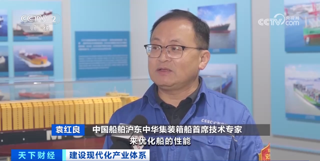 中国船舶沪东中华集装箱船首席技术专家 袁红良:一个是我们正通过流体力学CFD的软件来优化船的性能;还在目前现有的船上用了气泡减阻技术, 使得它能够节能。