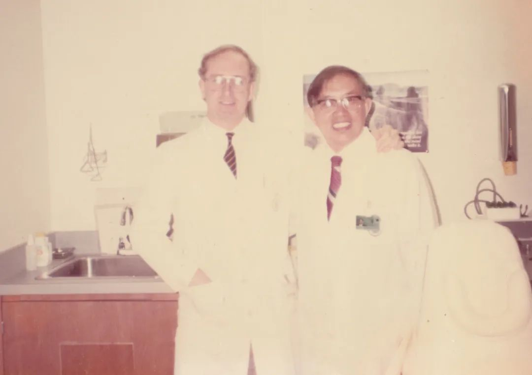 ▲1986年,赖钦声(右)在渥太华大学市民医院与口腔颌面外科主任Dr.Hardie(左)合影