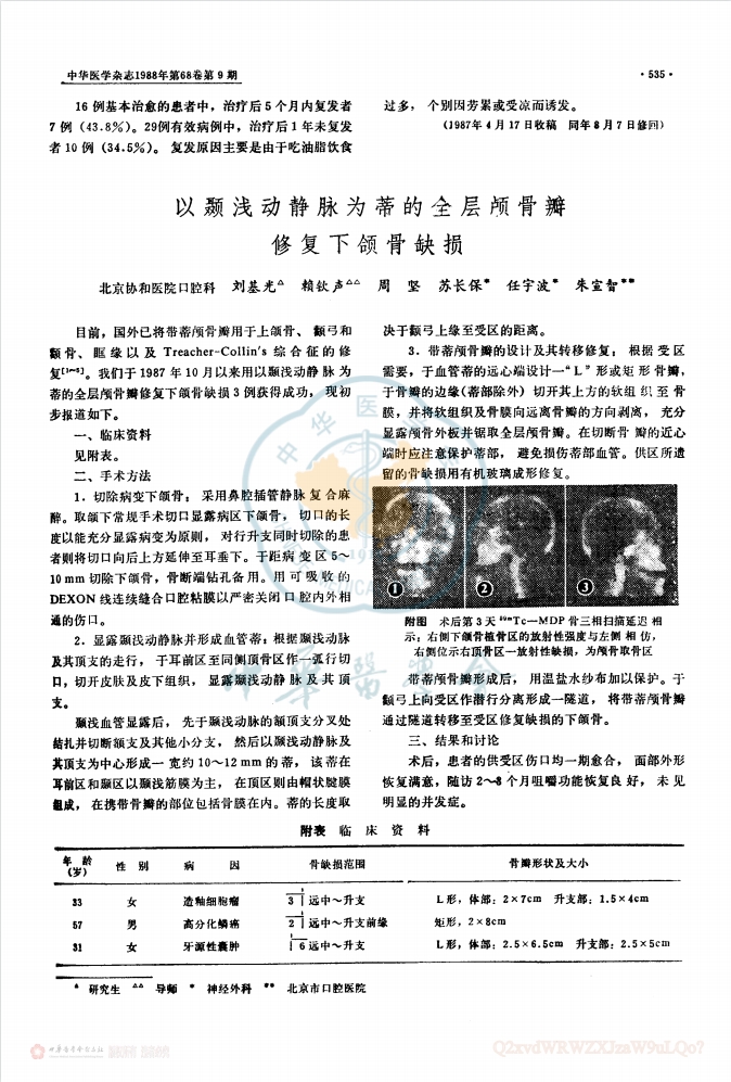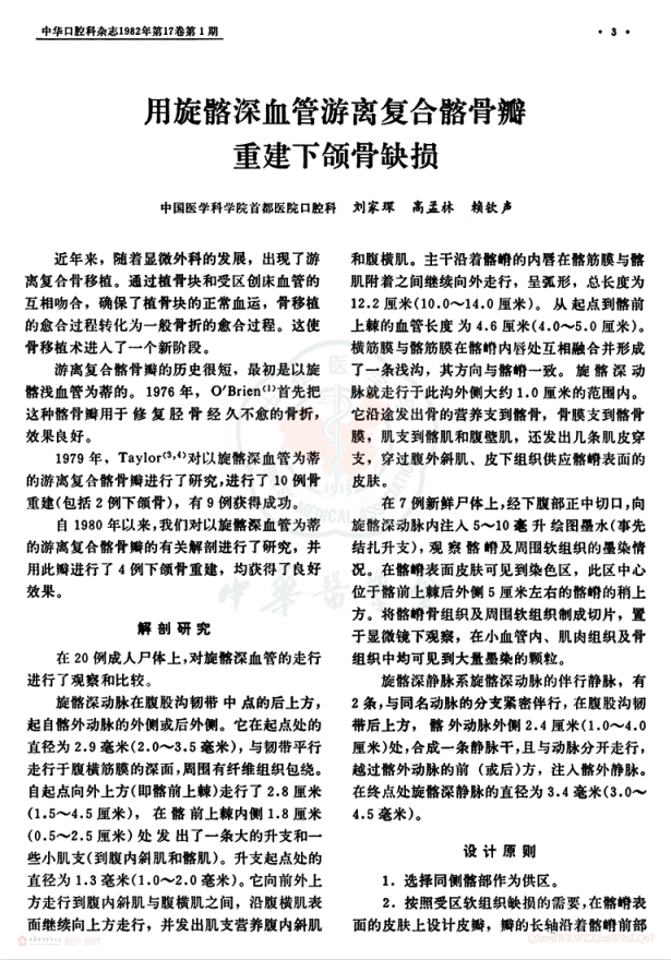 ▲刘家琛、高孟麟(又作高孟林)、赖钦声发表的论文《用旋髂深血管游离复合髂骨瓣重建下颌骨缺损》