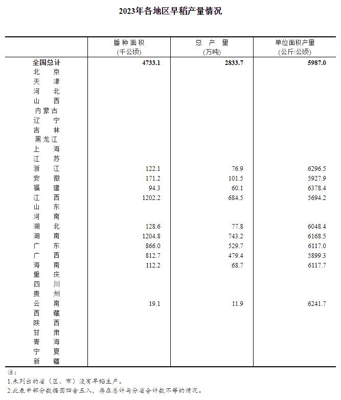 三、全国早稻总产量2833.7万吨(566.7亿斤),比2022年增加21.5万吨(4.3亿斤),增长0.8%。