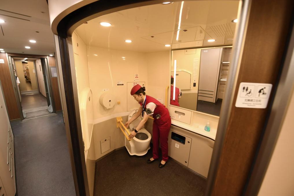 9月4日,福厦高铁“复兴号”智能动车组列车长余艳在介绍无障碍卫生间布局。新华社记者 林善传 摄