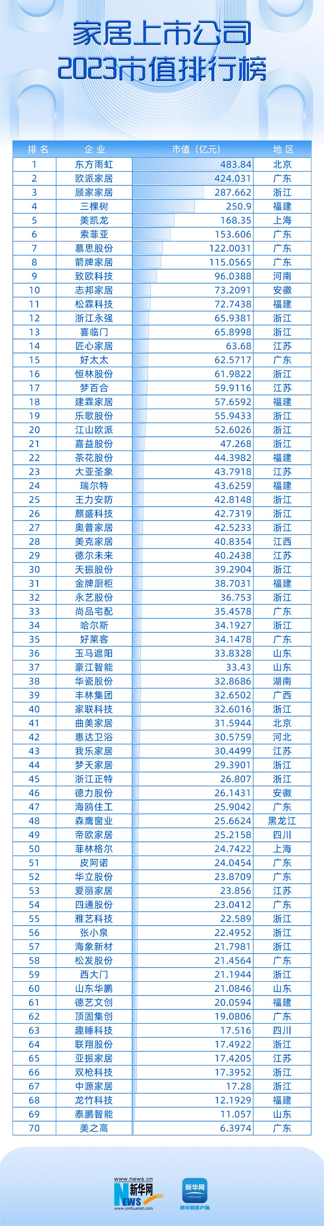 新华网上市公司事业部联合企查查,针对2023年(2022年12月30日至2023年12月29日)家居公司市值进行梳理,制作“2023中国家居上市公司市值排行榜”,以市值变化维度发现行业冷暖,从榜单数据探究家居产业发展趋势。