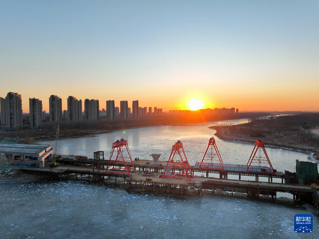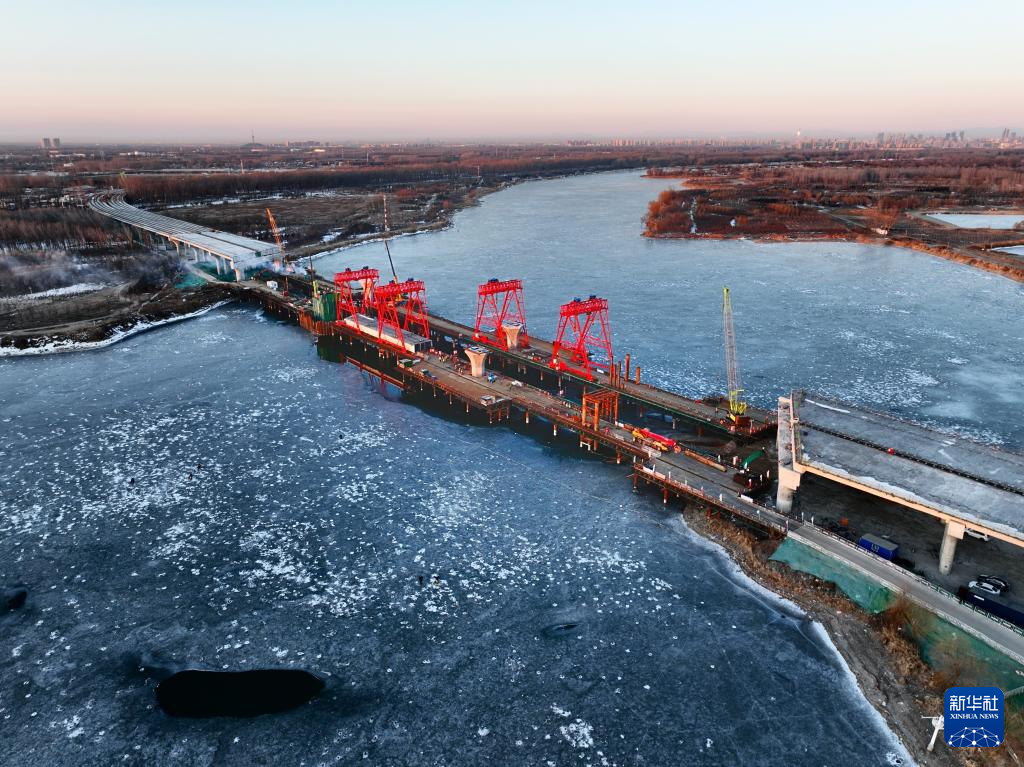 1月15日拍摄的建设中的厂通路潮白河大桥(无人机照片)。新华社记者 邢广利 摄