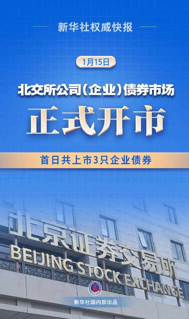 新华社北京1月15日电(记者姚均芳)1月15日,北京证券交易所公司(企业)债券市场正式开市,标志着高质量建设北交所迈出新步伐。