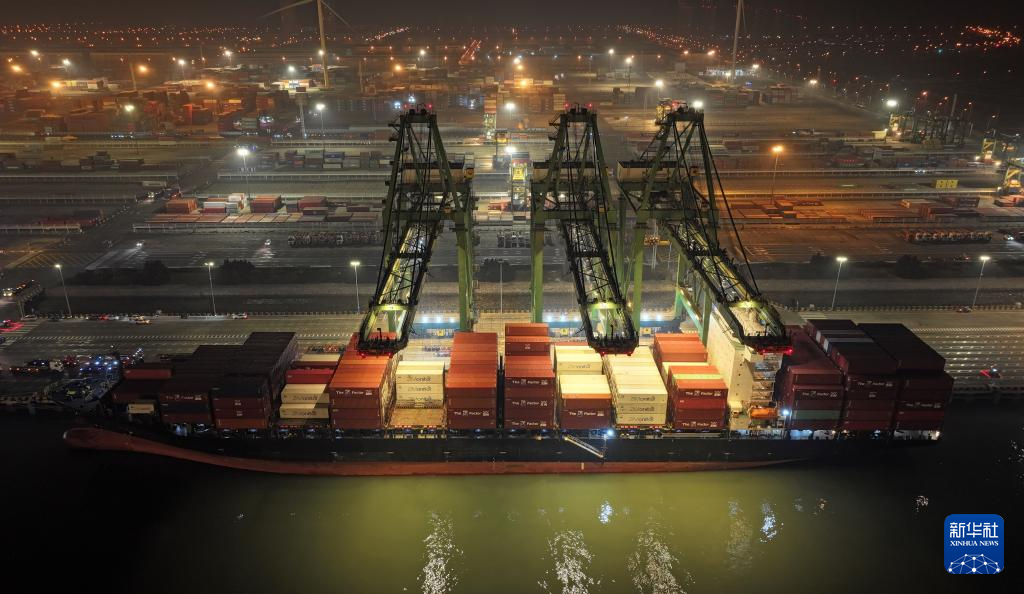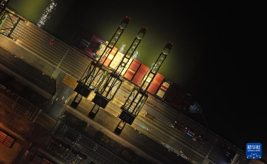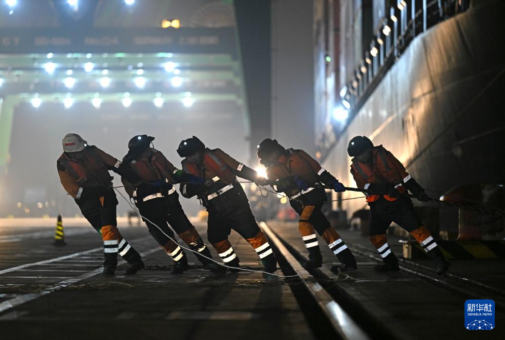 1月16日,工作人员在为刚靠泊码头的“巴赫”号集装箱班轮固定缆绳。新华社记者 赵子硕 摄