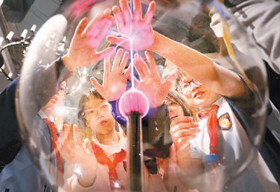 学生们在广东科学中心观察和体验“辉光球”放电现象。黄继明摄(人民图片)