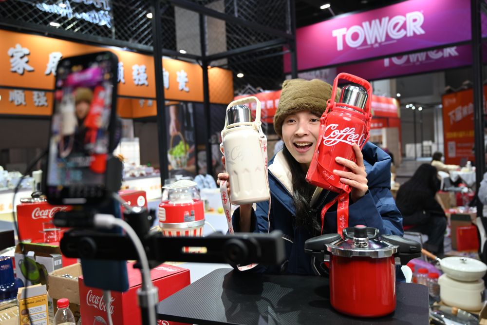 2023年12月21日,浙江省永康市一家保温杯企业电商部门的工作人员通过直播推介保温杯产品。新华社记者 韩传号 摄
