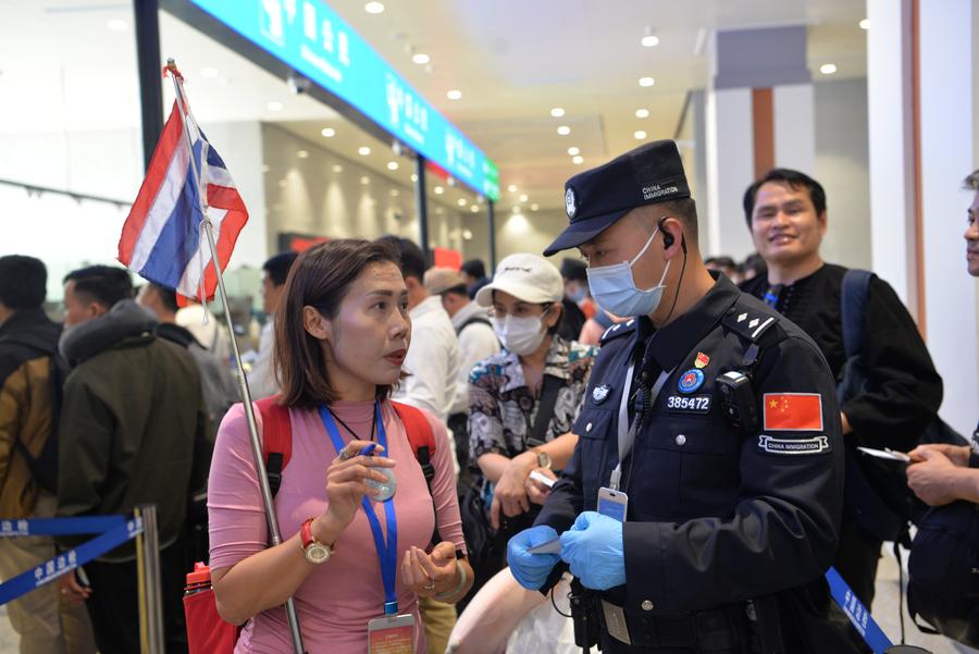 3月1日,中国与泰国互免持普通护照人员签证协定正式生效。当天13时许,由云南省国际旅行社西双版纳分社组织的泰国旅游团一行6人到达磨憨铁路口岸,成为首批搭乘中老铁路列车免签入境的泰国籍旅客。免签首日,磨憨出入境边防检查站共服务验放出入境泰国旅客210人次,同比增长200%。今年以来,该站已累计查验泰国籍旅客6048人次。