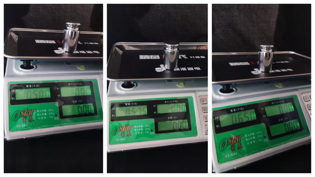 店主分别按下“M1、M2、M3、计数、电压、动态”等几个按键,同一桶洗洁精居然分别显示出“1175、1230、1285、1345、1400、1455”几个称重数值,最大增重335克。