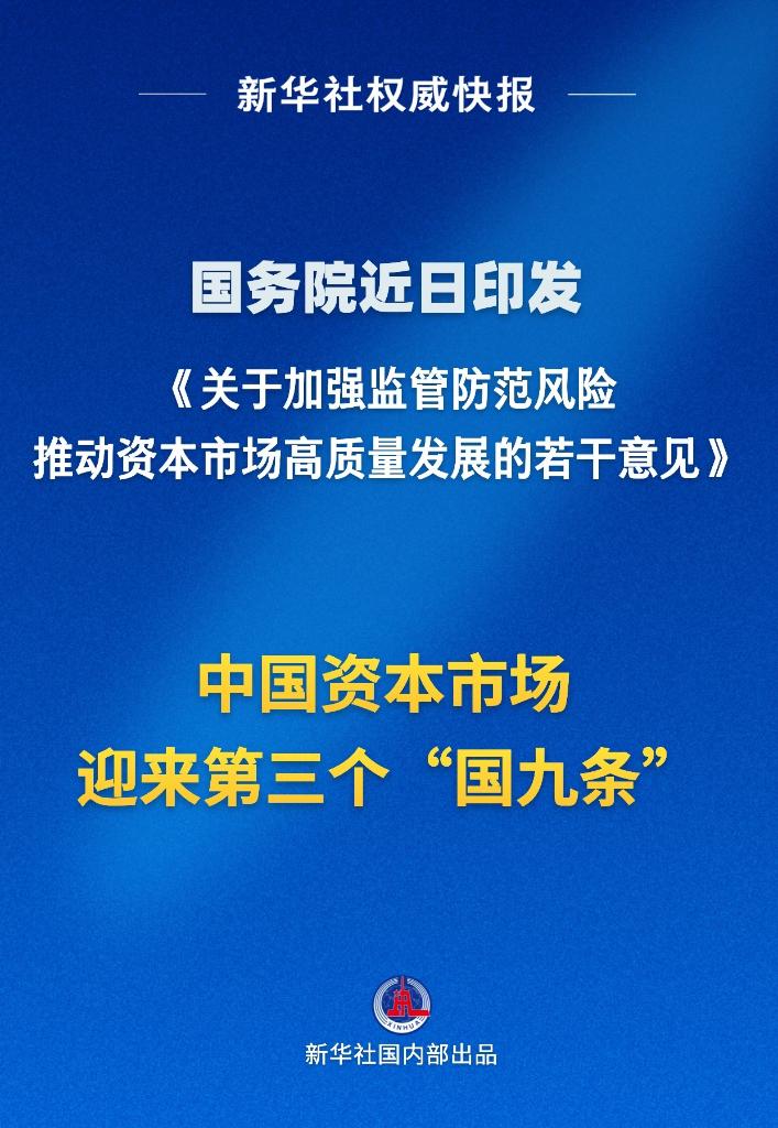 据介绍,这次国务院出台的意见深入贯彻习近平总书记关于资本市场的重要指示精神,落实中央金融工作会议部署,是继2004年、2014年两个“国九条”之后,国务院再次出台的资本市场指导性文件。