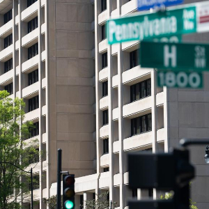 这是4月16日在美国华盛顿拍摄的国际货币基金组织总部。新华社记者 刘杰 摄