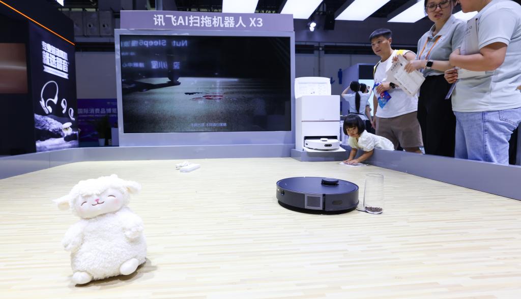 此次消博会,一些企业带来的智能家电产品也广受关注。“说哪扫哪、指哪扫哪”的讯飞AI扫拖机器人真的“听话”吗?在科大讯飞股份有限公司展区,观众们好奇地给扫地机器人随机设障、发出指令。