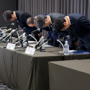 2024年3月29日,小林制药公司社长小林章浩(左二)及相关负责人在日本大阪举行的新闻发布会上鞠躬。新华社记者 张笑宇 摄