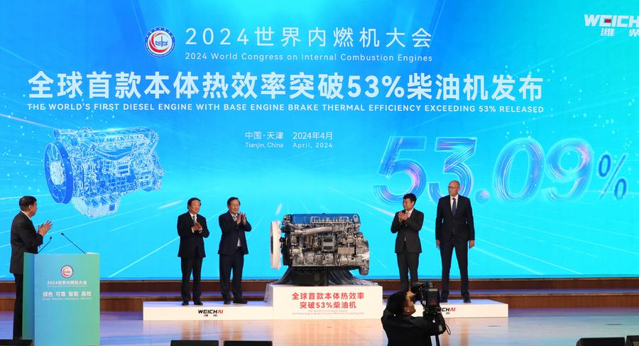 4月20日,在天津举办的2024世界内燃机大会开幕式上,中国内燃机行业最新技术成果——由潍柴动力研发的全球首款本体热效率突破53%的商业化柴油机发布。新华社发(天津大学供图)