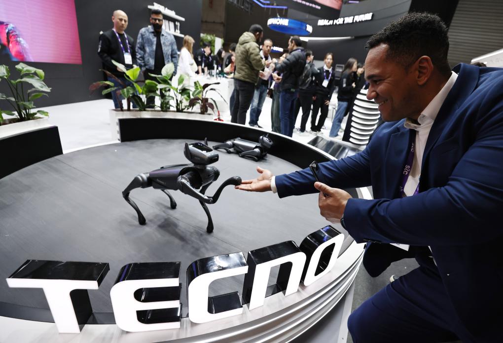 2月26日,在西班牙巴塞罗那举行的2024年世界移动通信大会上,人们参观传音旗下的TECNO展台。新华社记者高静摄