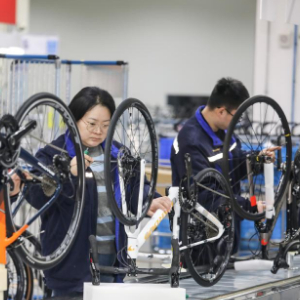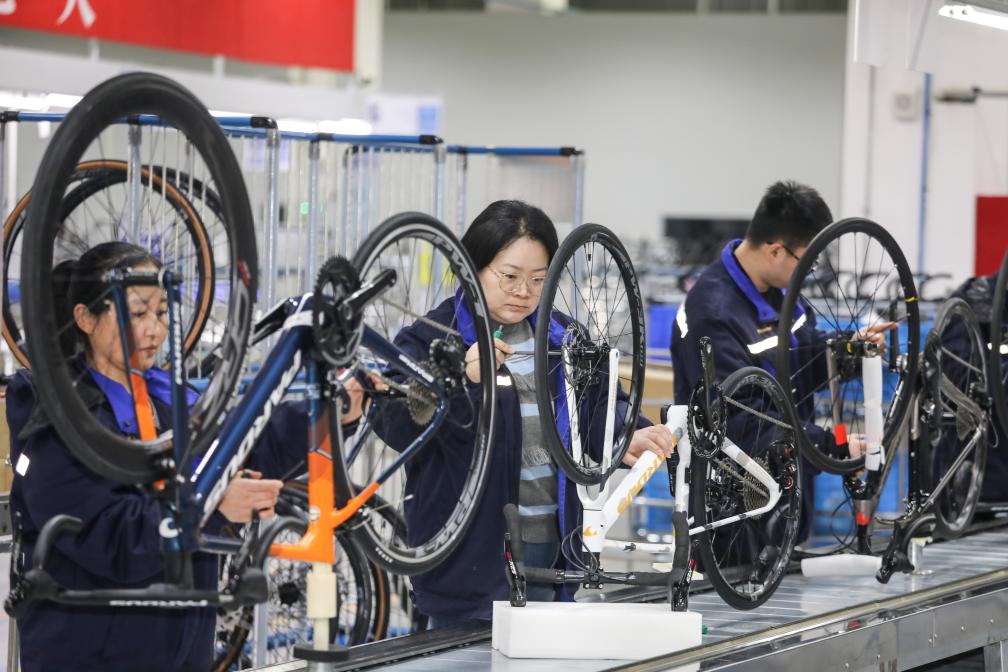 2月19日,工人在山东省乐陵市经济开发区一民营企业生产自行车。新华社发(贾鹏摄)