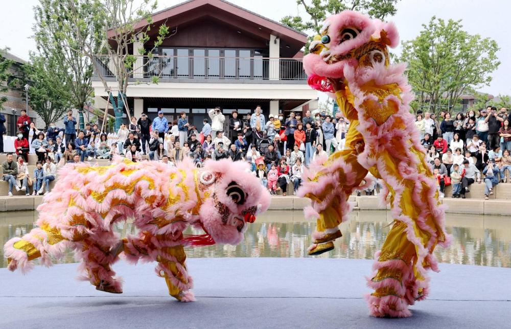 5月1日,游客在浙江省湖州市德清县新市古镇观看舞狮表演。