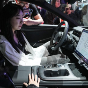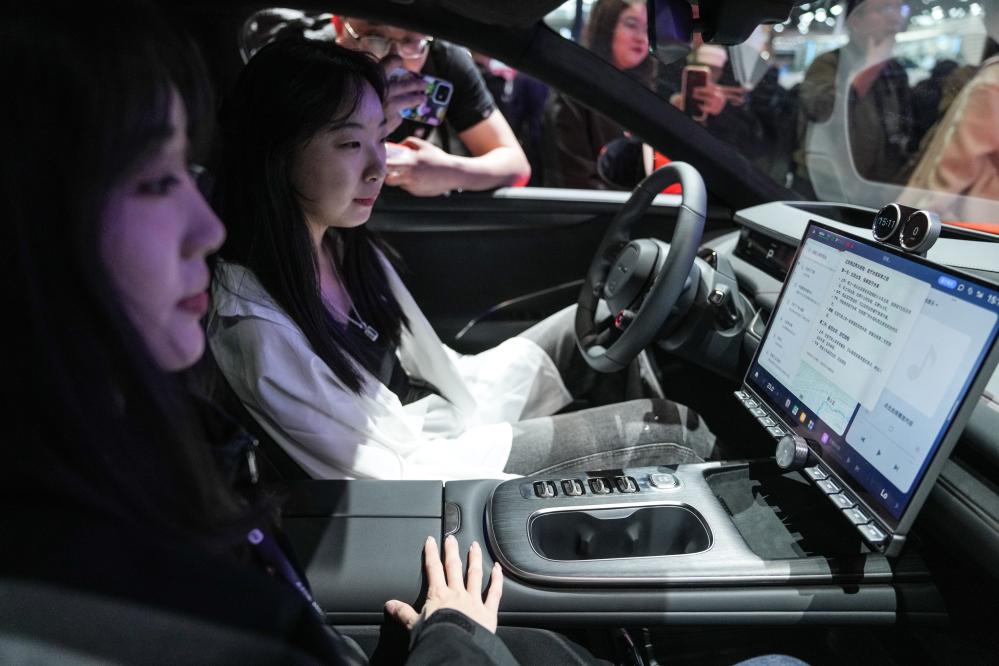 4月28日,在北京车展上,观众在小米su7新能源汽车内体验人工智能应用。 新华社记者 彭子洋 摄