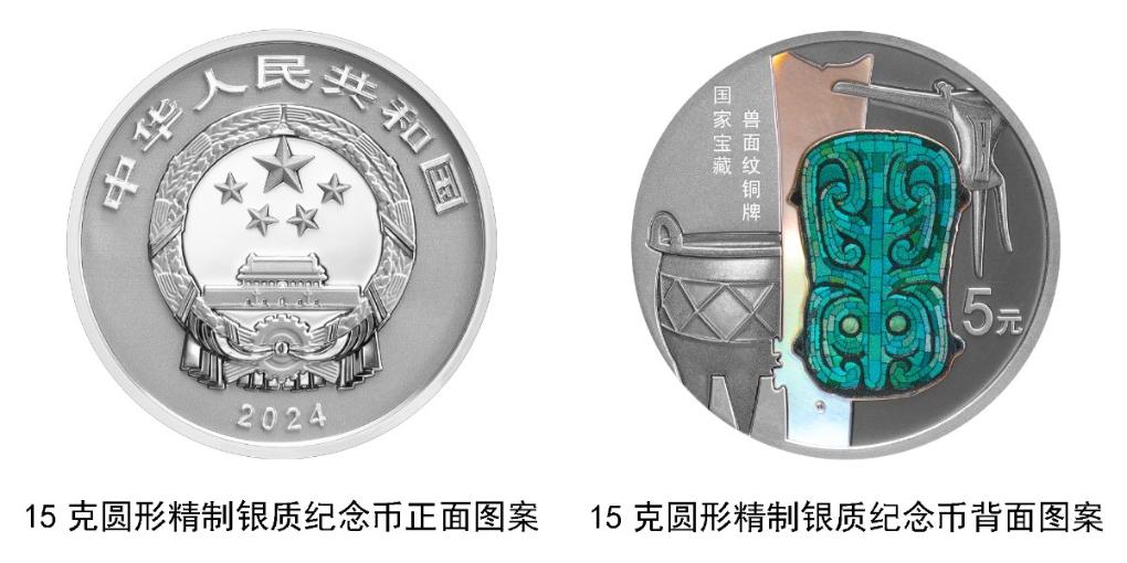 15克圆形银质纪念币背面图案为兽面纹铜牌、鼎、璋、爵等组合设计,并刊“国家宝藏 兽面纹铜牌”字样及面额。