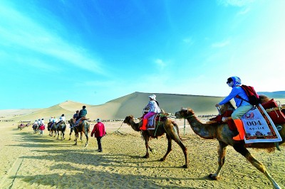 游客在甘肃敦煌鸣沙山月牙泉景区骑骆驼游览。新华社发