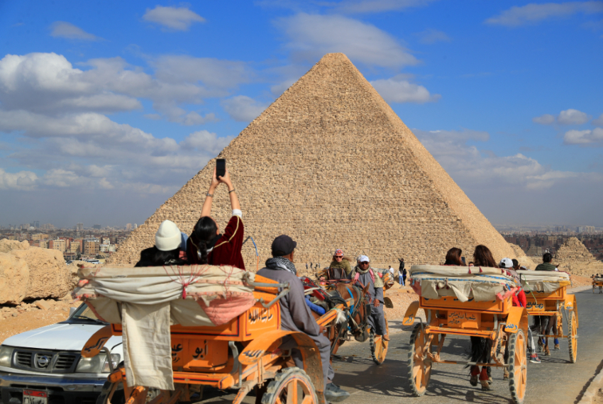 1月24日,游客乘马车游览埃及吉萨金字塔景区。 新华社记者 隋先凯 摄