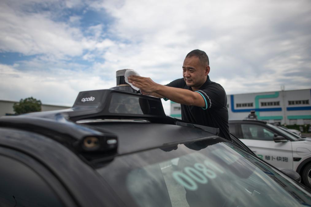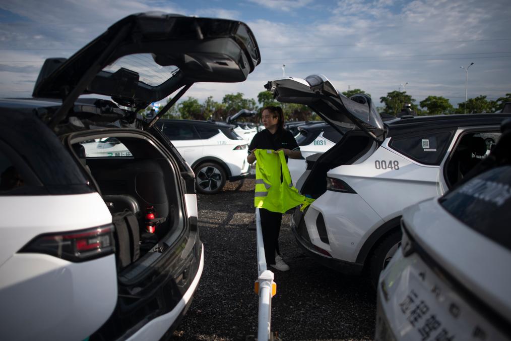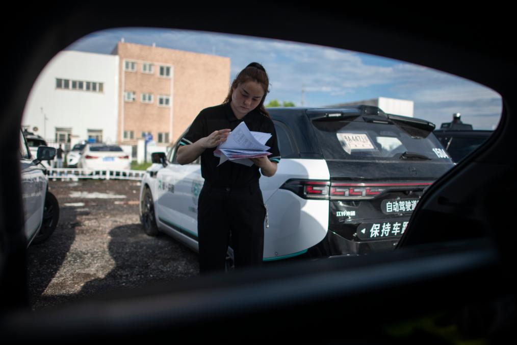 智能网联汽车测试员王娟在做路测前准备工作(7月4日摄)。