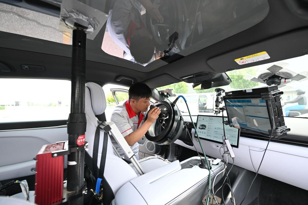 在中汽研汽车检验中心(天津)有限公司,张诚在一辆智能网联汽车内做测试(6月19日摄)。