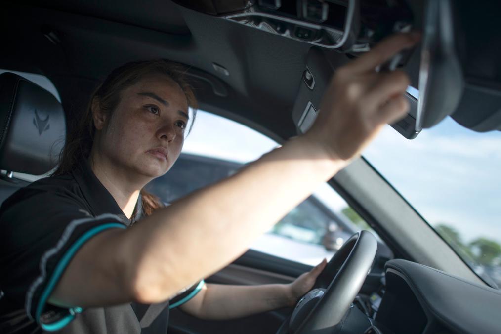 智能网联汽车测试员王娟在进行路测前调整后视镜(7月4日摄)。