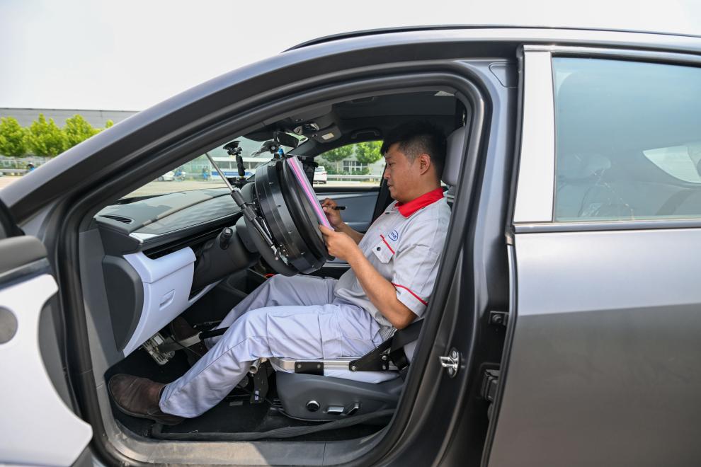 在中汽研汽车检验中心(天津)有限公司,张诚为一辆即将测试的智能网联汽车安装转向机器人(6月19日摄)。