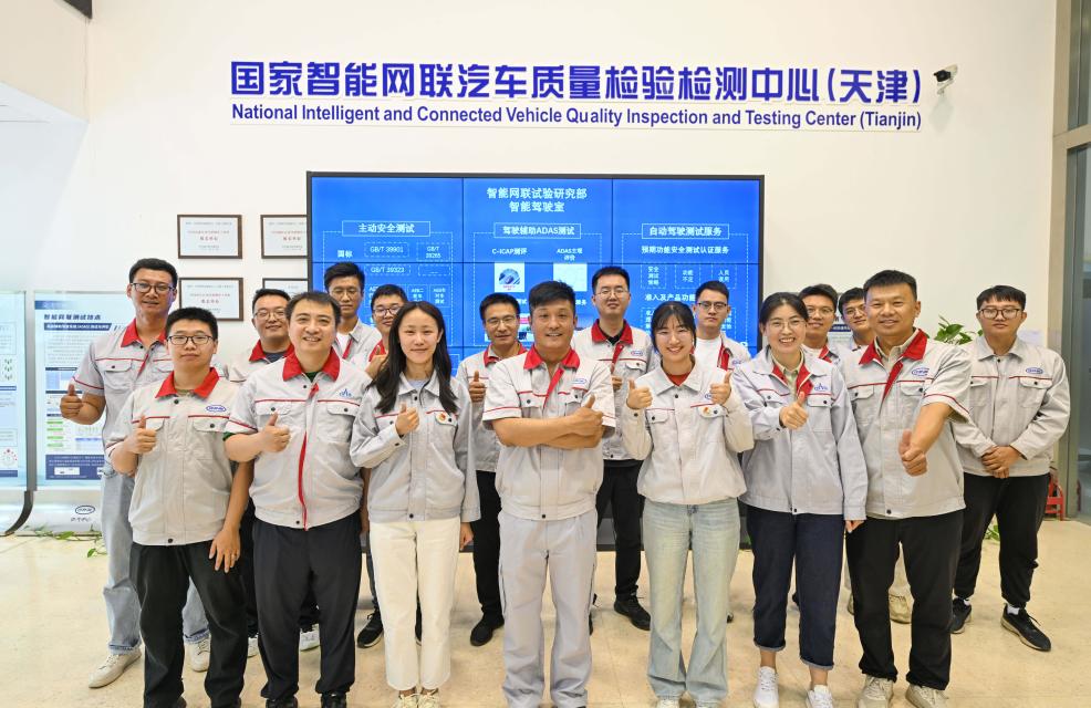 在国家智能网联汽车质量检验检测中心(天津),张诚与智能驾驶室部分成员合影(6月19日摄)。