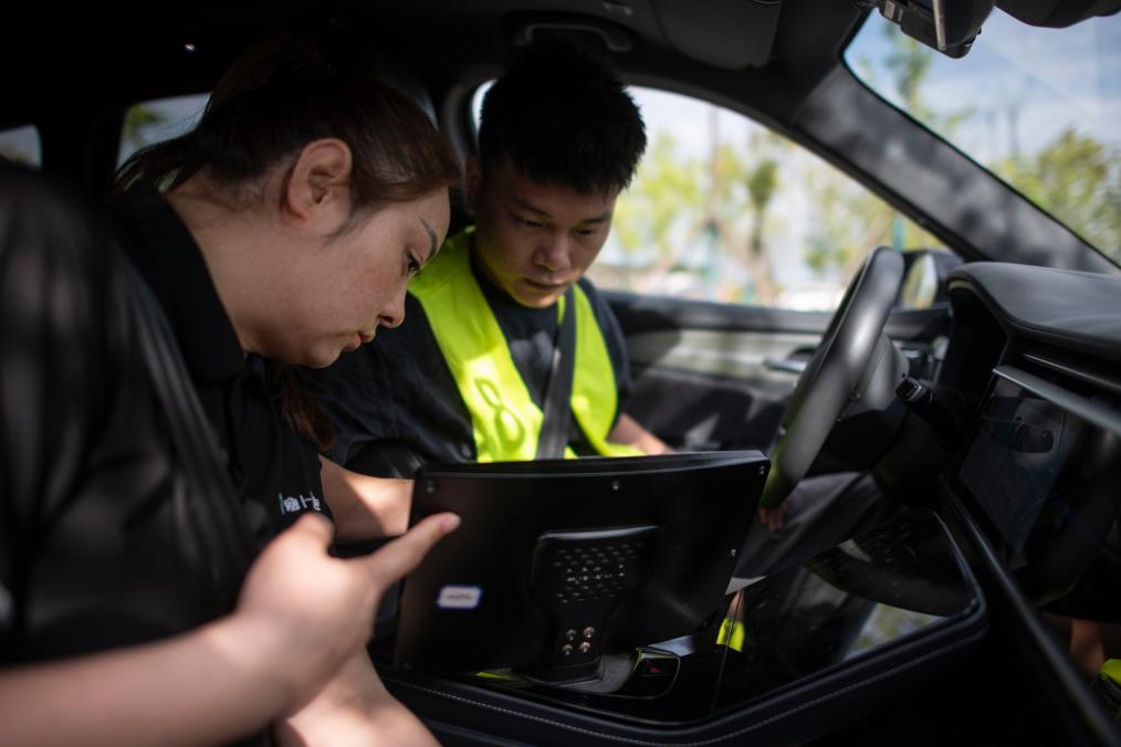 智能网联汽车测试员王娟(左)在给新员工进行路测培训(7月4日摄)。