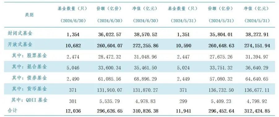 中国基金业协会最新数据显示,截至2024年6月底,中国境内公募基金资产净值合计31.08万亿元。