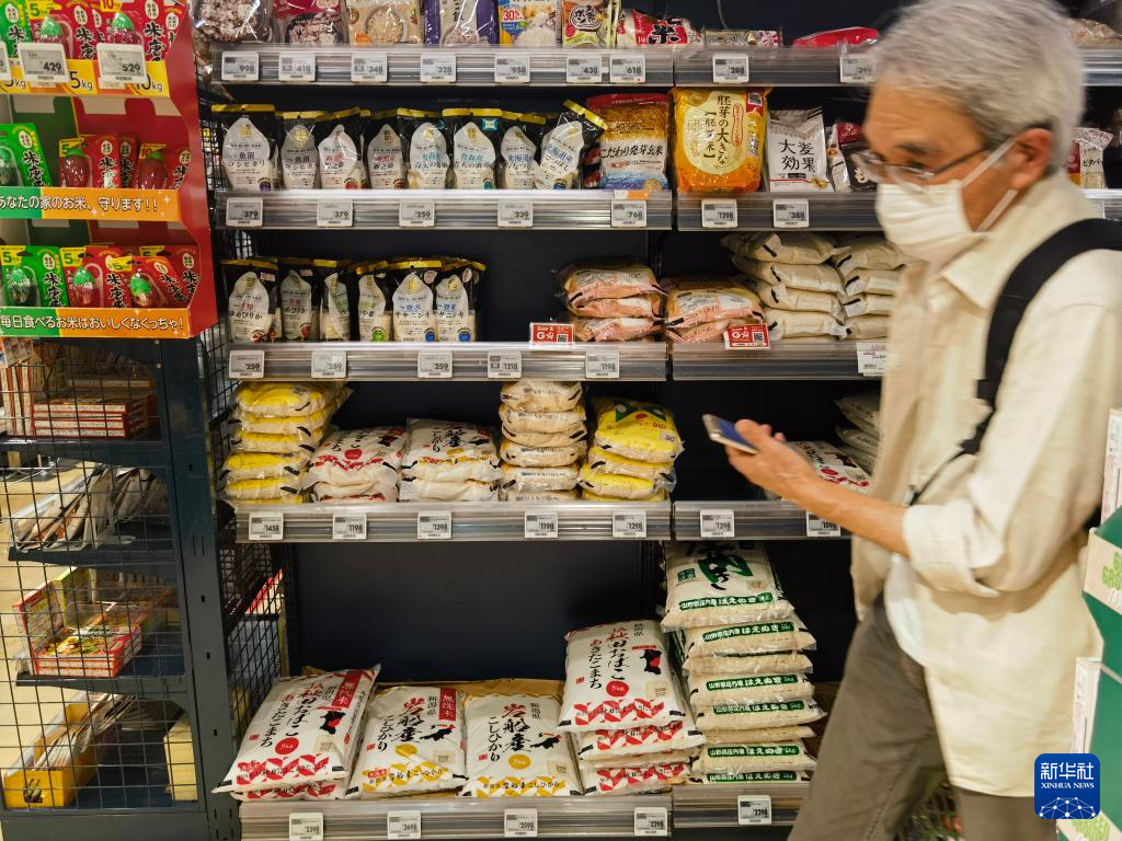 7月26日,在日本东京一家连锁超市,一名男子经过摆放大米的货架(手机照片)。新华社记者 钟雅 摄