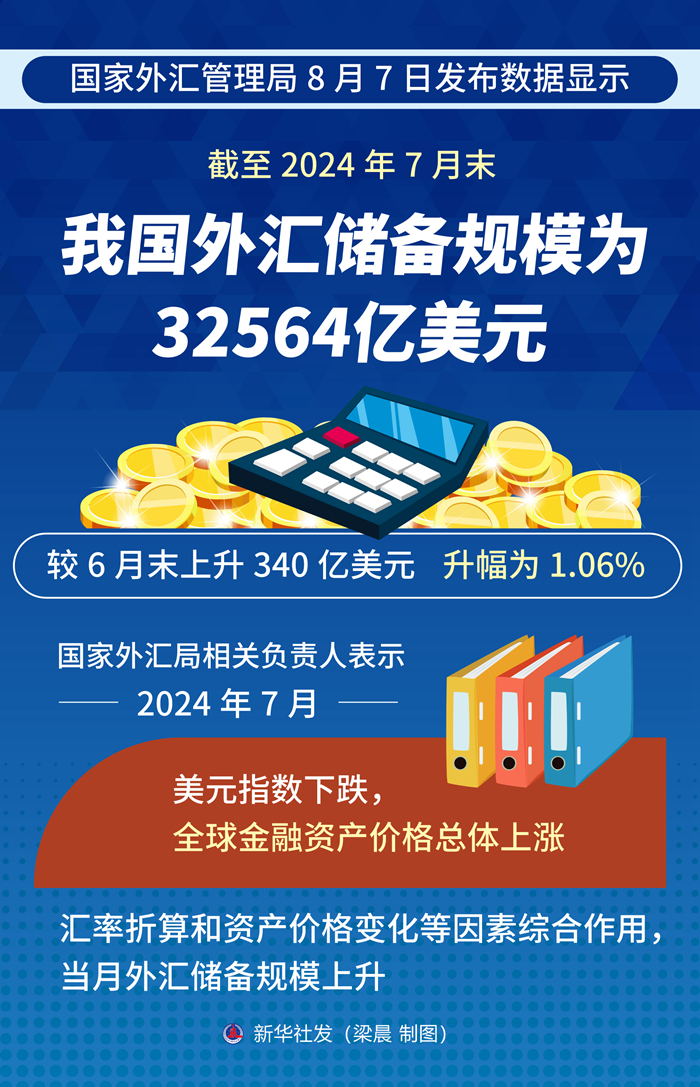 新华社北京8月7日电(记者张千千、刘开雄)国家外汇管理局7日发布数据显示,截至2024年7月末,我国外汇储备规模为32564亿美元,较6月末上升340亿美元,升幅为1.06%。