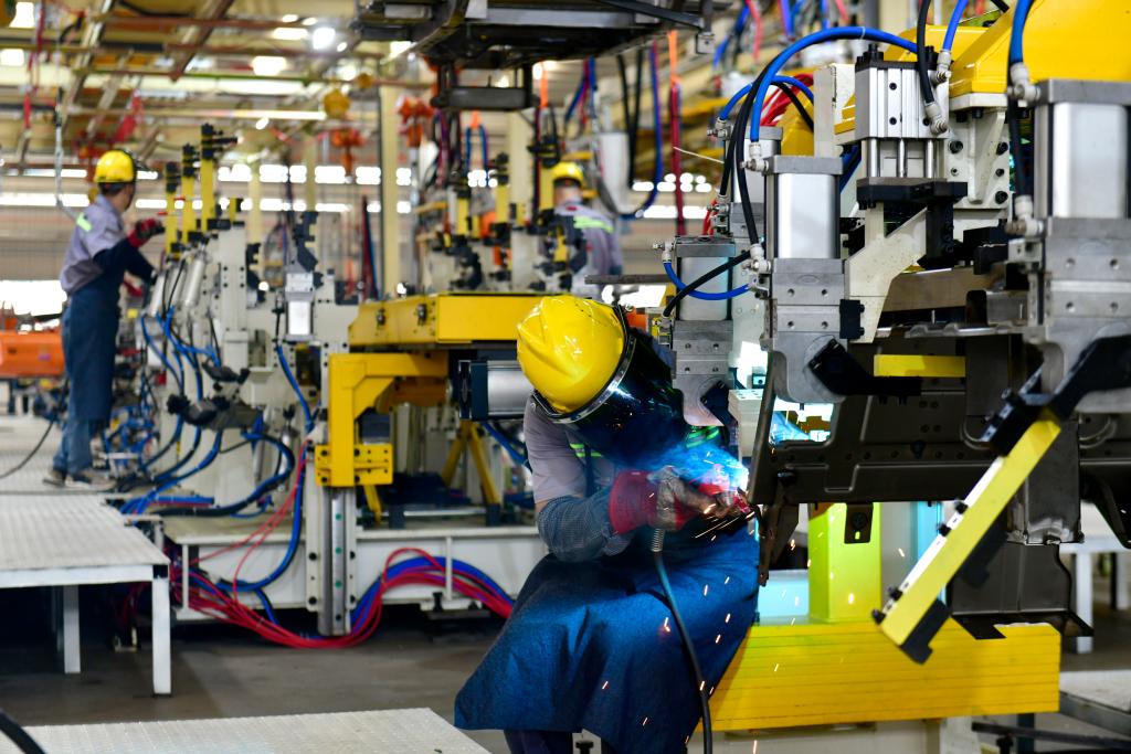 2024年7月24日,在山东永利新能源车业有限公司,工作人员在流水线上焊接高尔夫球车车架。新华社记者郭绪雷摄