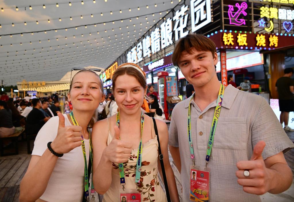 2024年7月19日,外国友人在青岛西海岸新区金沙滩啤酒城会场内合影。新华社记者李紫恒摄
