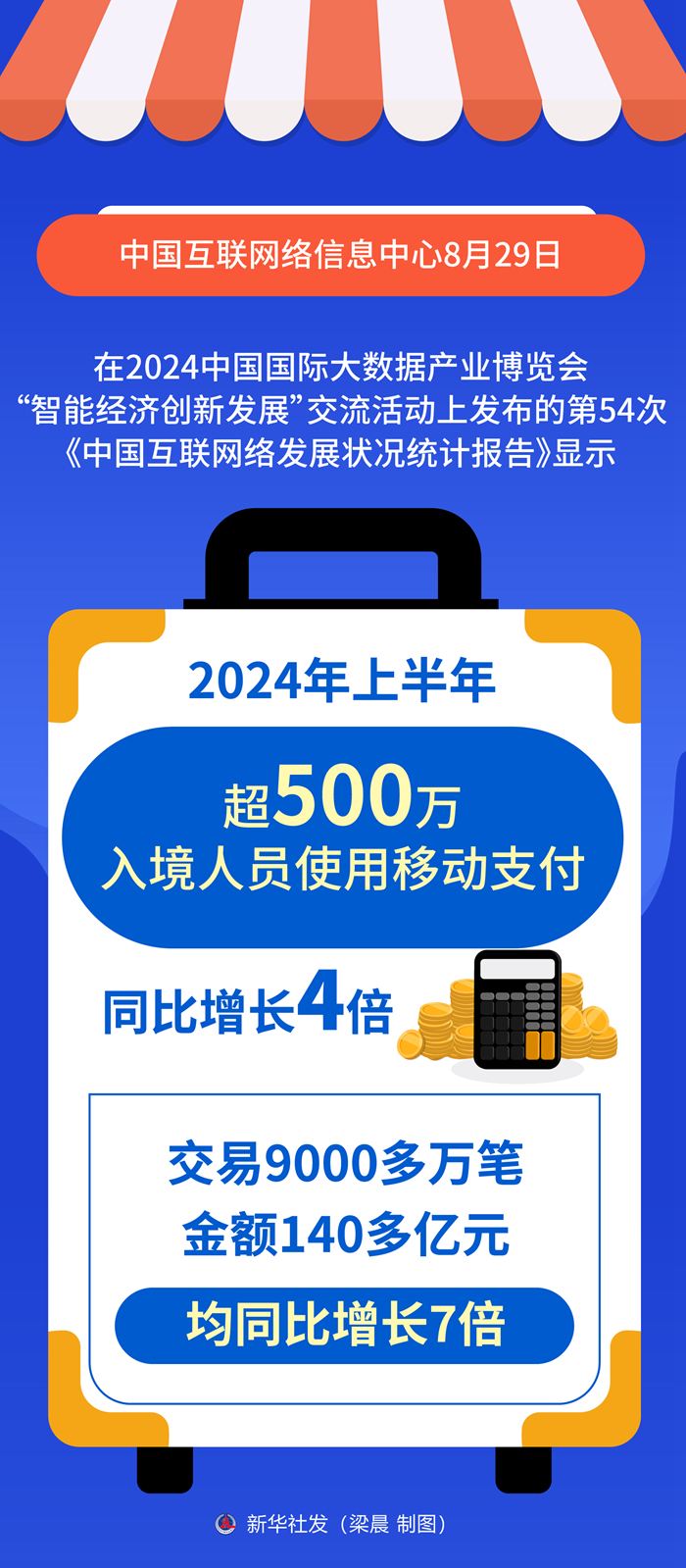中国互联网络信息中心29日在2024中国国际大数据产业博览会“智能经济创新发展”交流活动上发布第54次《中国互联网络发展状况统计报告》,其中显示,今年上半年,超500万入境人员使用移动支付,同比增长4倍;交易9000多万笔,金额140多亿元,均同比增长7倍。