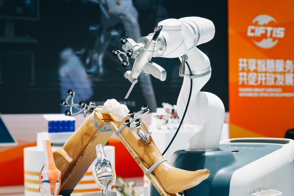 9月13日在服贸会国家会议中心展区拍摄的一款人工智能骨科手术机器人。该机器人由“智慧脑+智慧手+智慧眼”组合而成,能够辅助医生将术前人工智能定制的方案在术中精准实施。新华社记者 曹梦瑶 摄