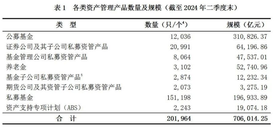 中国基金业协会近日发布的数据显示,截至2024年二季度末,基金管理公司及其子公司、证券公司及其子公司、期货公司及其资管子公司、私募基金管理机构资产管理产品总规模达70.6万亿元。