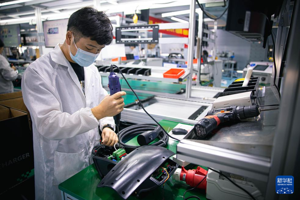 2023年4月19日,工人在浙江省乐清市奔一新能源有限公司的生产线上工作。新华社记者 江汉 摄