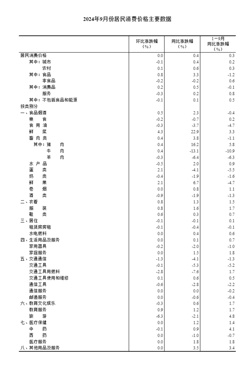 2024年9月份,全国居民消费价格同比上涨0.4%。其中,城市上涨0.4%,农村上涨0.6%;食品价格上涨3.3%,非食品价格下降0.2%;消费品价格上涨0.5%,服务价格上涨0.2%。1—9月平均,全国居民消费价格比上年同期上涨0.3%。