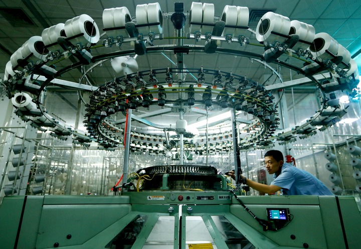 10月7日,山东省青岛市即墨区龙山街道一家纺织企业的工人在生产出口到海外市场的服装面料产品。新华社发(梁孝鹏摄)