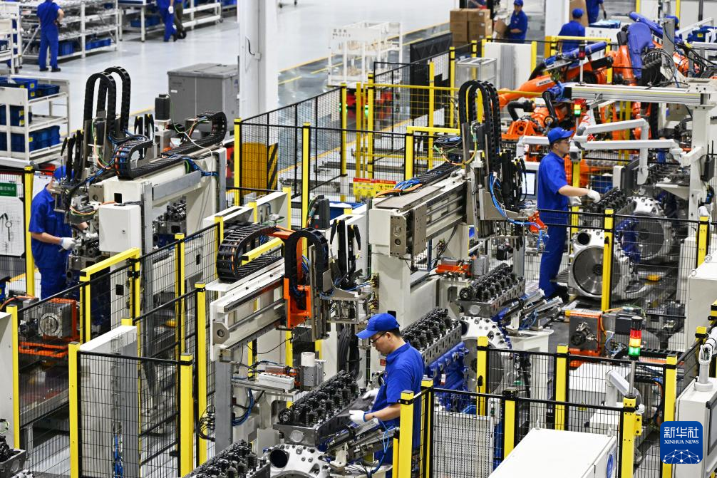 在潍柴集团车间内,工人在装配发动机(8月21日摄)。新华社记者 李紫恒 摄