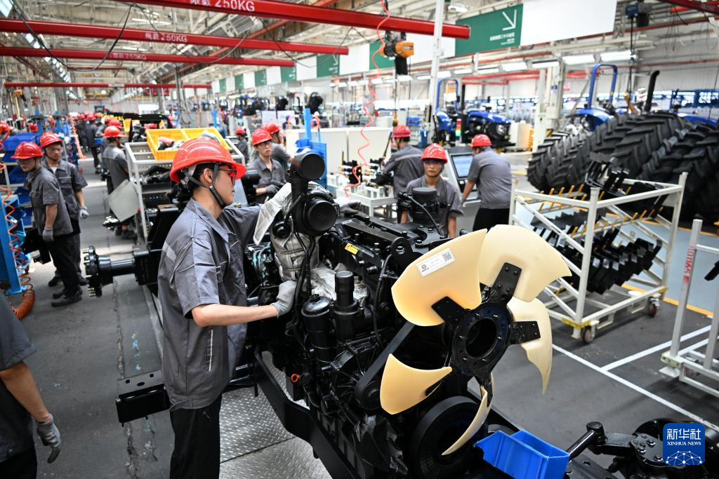 在潍柴雷沃智慧农业科技股份有限公司拖拉机工厂总装车间,工人在为拖拉机安装发动机(8月21日摄)。新华社记者 李紫恒 摄