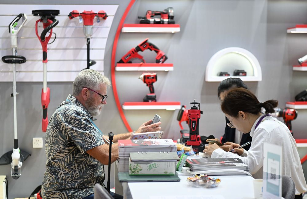 境外采购商(左)在第136届广交会上的一处电动工具展台洽谈(10月15日摄)。新华社记者 邓华 摄