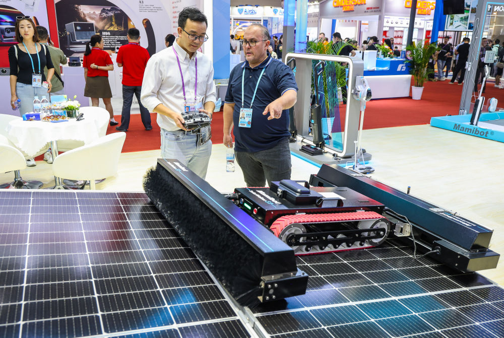 采购商在第136届广交会展馆了解一款太阳能面板自动清洁机器人产品(10月15日摄)。新华社记者 刘大伟 摄
