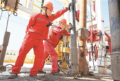 在山东省东营市胜利油田利斜856钻井现场,胜利石油工程公司渤海50691钻井队员工进行起下钻施工,加快石油勘探开发步伐。王国章摄(人民视觉)