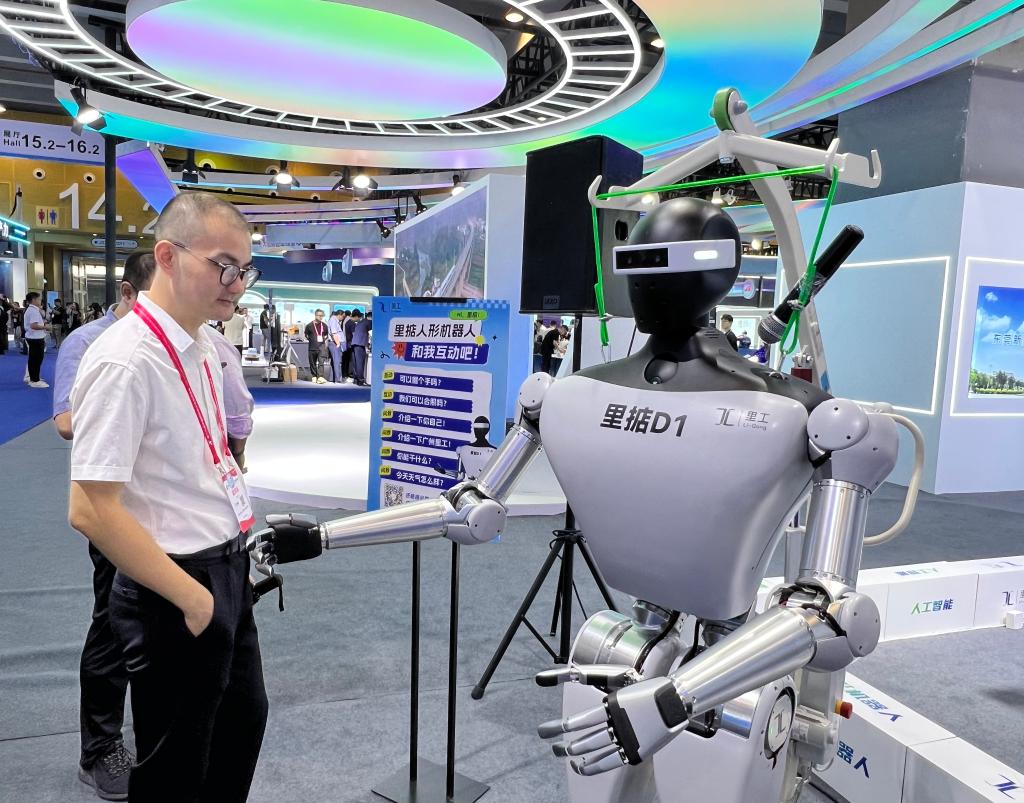 图为“里掂人形机器人”和观众交流互动。新华社发(李俊豪 摄)